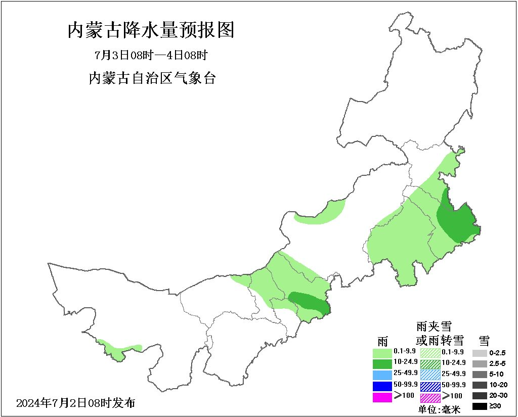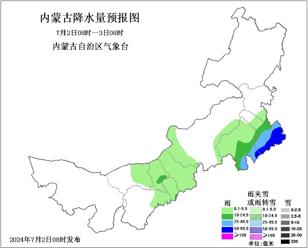 今天,西部偏东、中部偏西和东南部地区多云,巴彦淖尔市东部、鄂尔多斯市东北部、包头市、呼和浩特市、乌兰察布市、锡林郭勒盟西部和东南部、赤峰市、通辽市、兴安盟南部有小雨,其中,包头市东南部、呼和浩特市南部偏南、赤峰市中南部、通辽市中南部有中雨,赤峰市南部、通辽市南部有大雨,赤峰市东南部、通辽市南部偏南地区有暴雨,上述地区伴有短时强降水、雷暴大风、冰雹等强对流天气,其余地区晴间多云;阿拉善盟西北部有35度及以上高温天气。