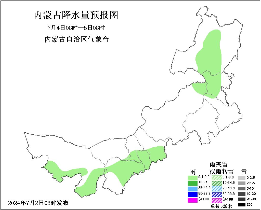 明天,西部偏南、中部大部和东南部地区多云,阿拉善盟南部偏南、巴彦淖尔市东北部、包头市北部、呼和浩特市北部、乌兰察布市、锡林郭勒盟西部偏西和北部部分地区、赤峰市、通辽市、兴安盟南部和东部有小雨,其中,乌兰察布市南部部分地区、通辽市东部、兴安盟南部偏南有中雨,上述地区伴有短时强降水、雷暴大风、冰雹等强对流天气,其余地区晴间多云;阿拉善盟西部有35度以上的高温天气。