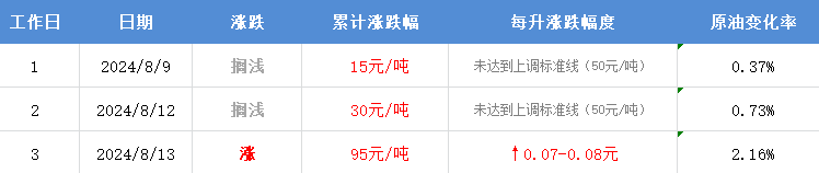 8月13日,本轮国内油价计价统计周期第3个工作日,今日参考原油变化率为2.16%,预计汽柴油价格分别上调95元/吨,折算为每升油价上涨0.07-0.08元,油价调价时间:8月22日24时。