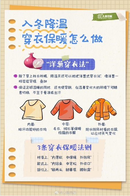 降温期间,身体哪些部位要重点保暖?“洋葱穿衣法”你学会了吗?常见御寒误区、暖宝宝热水袋的正确使用方式,你了解吗?入冬必备的防寒保暖小知识,请收藏。