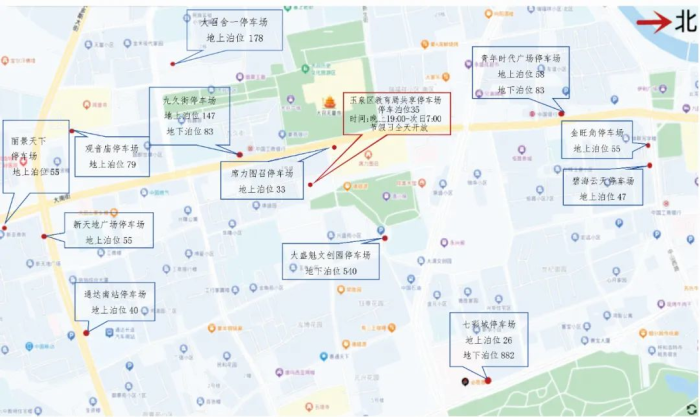 青年时代广场停车场地上地下共141个车位;金旺角停车场地上55个车位;碧海云天停车场地上47个车位;七彩城停车场地上地下共908个车位;大盛魁文创园停车场地下泊位540个;席力图召停车场地上泊位33个;大召舍一停车场地上泊位178个;九久街地上地下停车泊位共230个;观音庙地上停车泊位79个;新天地广场停车场地上泊位55个;通达南站地上停车场泊位40个;丽景天下停车场地上泊位55个。