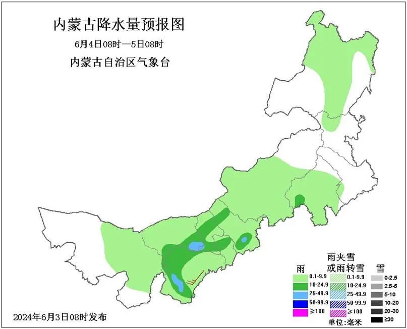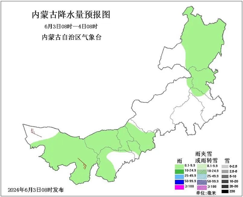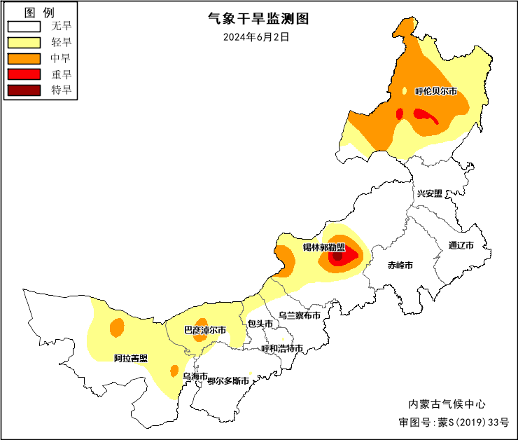 连日来的降水有效降低了前期严峻的火险形势,同时会缓解旱情。据内蒙古气象部门监测显示,目前,全区一类、二类、三类墒情面积分别为17.7、25.8、73.6万平方公里,占全区总面积的15.1%、22.1%、62.8%;全区土壤墒情接近去年同期,差于历年同期。截至6月2日,中西部偏北及呼伦贝尔市大部存在轻度及以上气象干旱,其中锡林郭勒盟中部、呼伦贝尔市中部存在重至特旱。预计此轮降水过后,中部部分地区干旱或将有所缓和,西部、东部干旱可能持续或发展。建议各地农区要密切关注天气形势和农田土壤墒情变化,加强田间管理,必要时进行灌溉补水,防范干旱对农牧业生产的不利影响。具体未来三天预报如下: