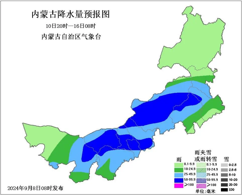 预计10日20时至16日08时,全区大部有小雨;其中,阿拉善盟中部以东至兴安盟大部有中到大雨,阿拉善盟东北部、巴彦淖尔市大部、鄂尔多斯市西北部、包头市中部和南部、呼和浩特市中部和北部、乌兰察布市北部偏北和南部、锡林郭勒盟中西部、赤峰市北部、通辽市西北部累计可达暴雨,上述地区伴有短时强降水、雷暴大风等强对流天气。