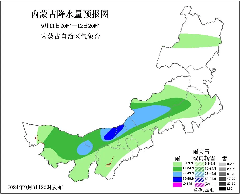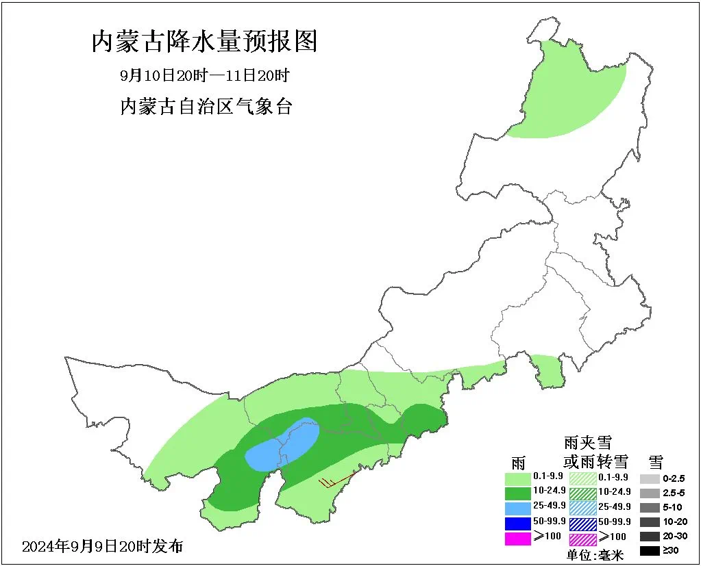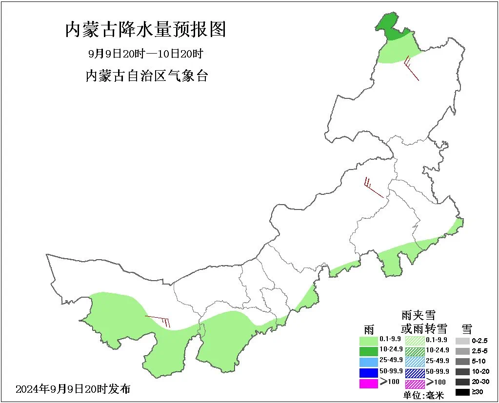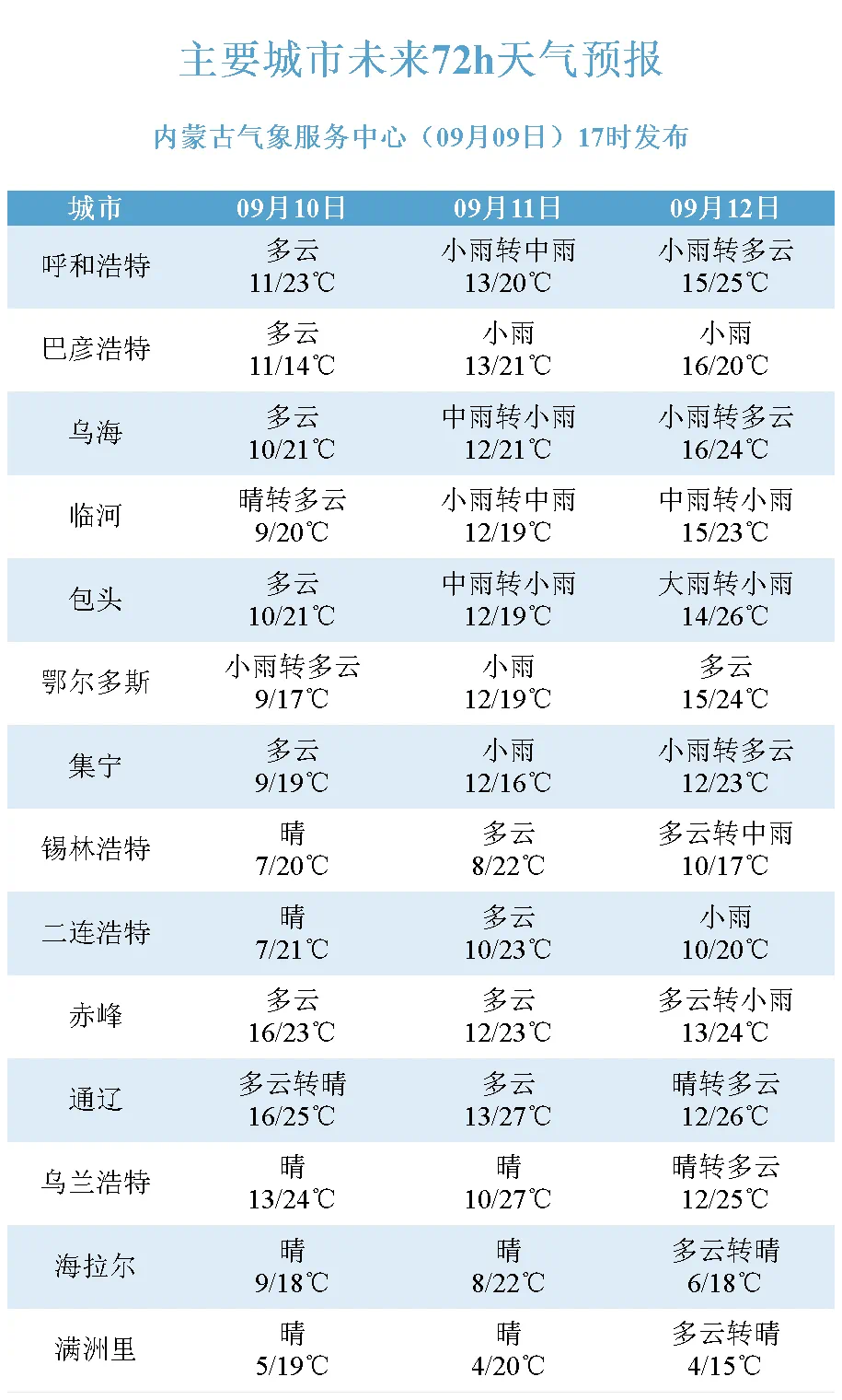 09日20时至10日20时,中西部偏南和东部部分地区多云,阿拉善盟南部、乌海市、鄂尔多斯市大部、呼和浩特市西南部、乌兰察布市南部、锡林郭勒盟南部、赤峰市南部、通辽市南部偏南、呼伦贝尔市西北部有小雨,其中,呼伦贝尔市西北部偏北有中雨,上述地区伴有短时强降水、雷暴大风等强对流天气,其余地区晴间多云;西部偏西南、中部偏东和东北部地区4、5级短时6、7级偏东风或西北风;东部偏南地区气温下降6到8℃,局部地区气温下降8℃以上。