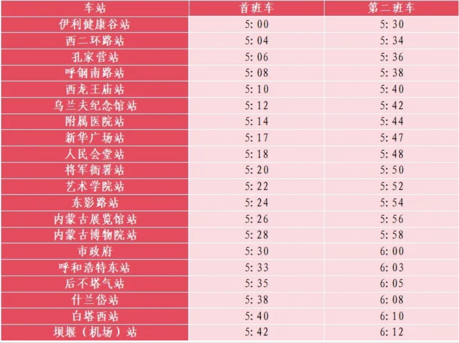 地铁1号线伊利健康谷站开往坝堰(机场)站方向加开两列列车,首班车5:00发车,第二班车5:30发车,坝堰(机场)站开往伊利健康谷站发车时间不变,首班车6:00发车;
