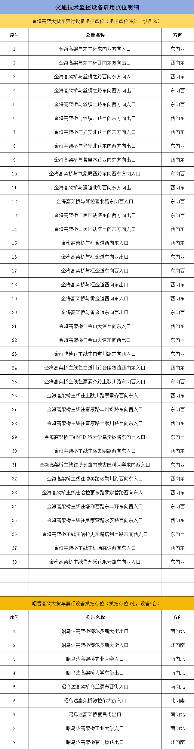 为进一步提升首府道路交通管理水平,创造良好交通环境,我市对城区道路交通技术监控系统进行了升级改造。根据《中华人民共和国道路交通安全法》、《中华人民共和国道路交通安全法实施条例》、公安部《道路交通安全违法行为处理程序规定》、《呼市公安局交通管理支队交通管制通告[2020]20号》等法律、法规规定,以下交通技术监控系统(电子警察)已达到规范要求,呼和浩特市公安局交管支队决定自2024年11月5日零时正式启用。