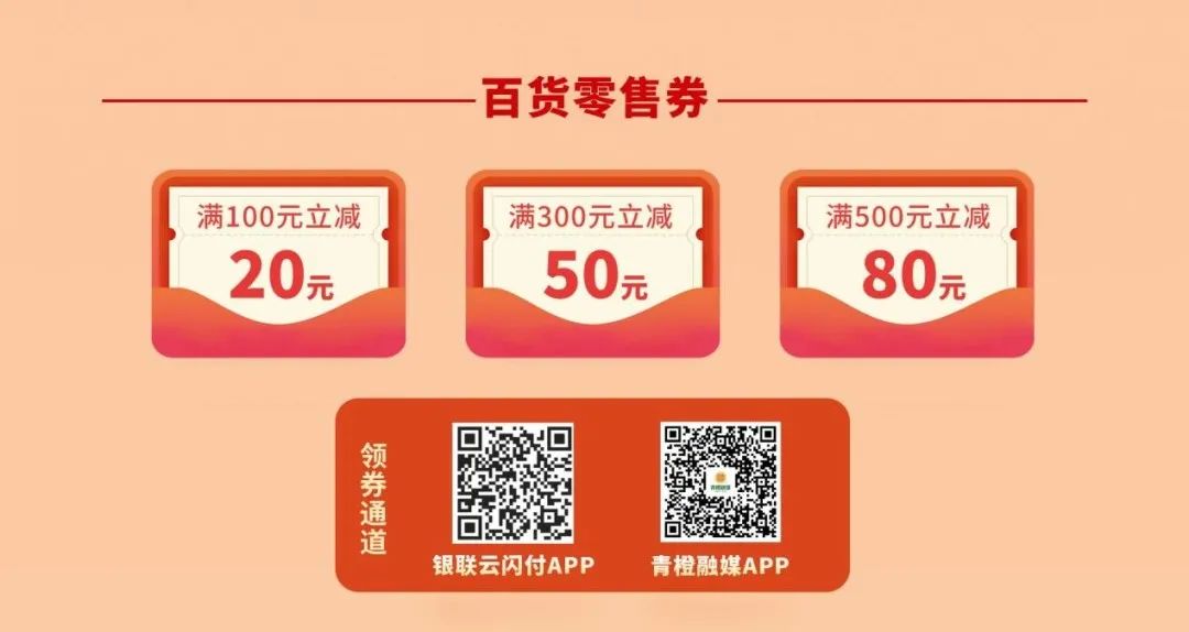 领用方式:活动期间,消费者可通过“银联云闪付APP”或“青橙融媒APP”进入活动专区领券,领券成功后当日内有效,在参与活动的实体店购物付款时直接抵用。