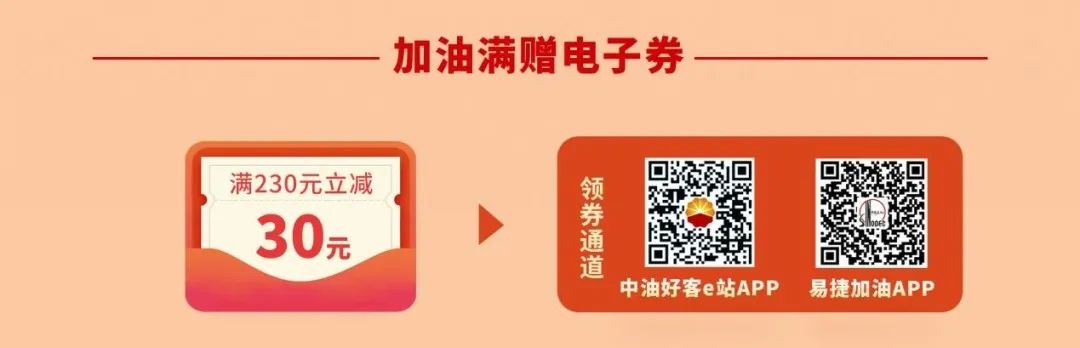领取方式:消费者下载中石油“中油好客e站APP”或中石化“易捷加油APP”,在其所属加油站加油(仅限汽油)满238元可获得“满230元减30元”满赠电子券1张(每个客户限领1张),自动进入APP券包。