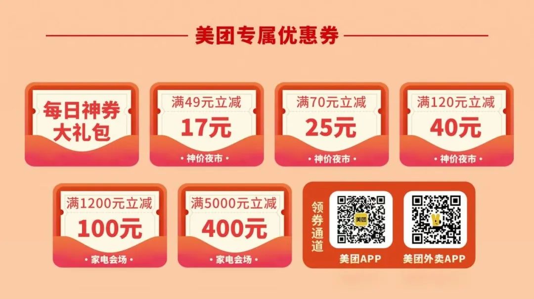领用方式:通过美团APP、团购及外卖餐饮专区线上参与领券或扫码领券,在美团平台参与活动的餐饮单位或家电商家使用。详情以企业实际活动为准。