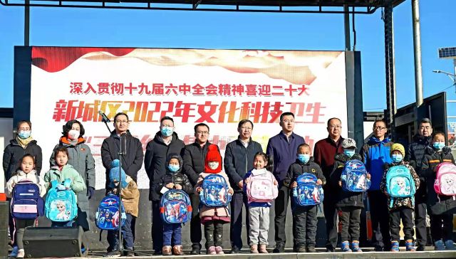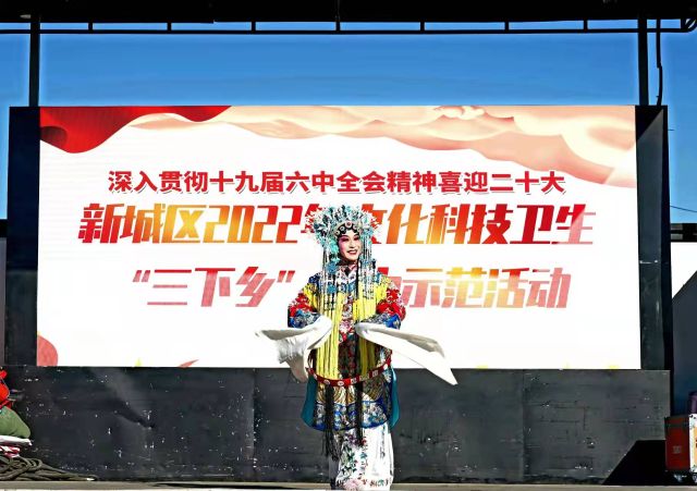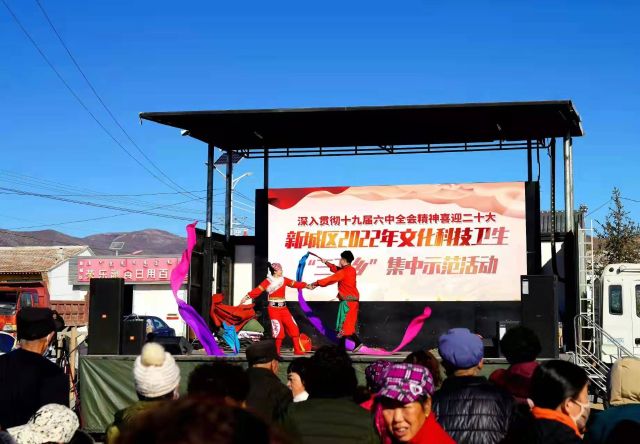 1月27日上午,由中共新城区委员会、新城区人民政府主办,中共区委宣传部、保合少镇、新城区文体旅游广电局承办的:新城区2022年文化、科技、卫生“三下乡”活动在保合少镇奎素村村委会广场举行。新城区文化馆乌兰牧骑文艺小分队和奎素村业余文艺团队共同为村民带来了一台精彩的文艺演出。欢快的锣鼓敲起来,亲切的小戏唱起来。二人台表演《挂红灯》,飞舞的红绸和着亲切熟悉的曲调,一开场就把正在忙年的村民们吸引到村委会广场了,村民们兴致勃勃的观看了集体舞《咱们屯的人》、晋剧清唱《大登殿》、二人台对唱《拜大年》、广场舞《没有共产党就没有新中国》等一个个精彩的文艺节目。歌舞声、欢笑声、喝彩声和掌声渲染了新春佳节的欢乐气氛,为村民带来了节庆的欢乐和祝福。