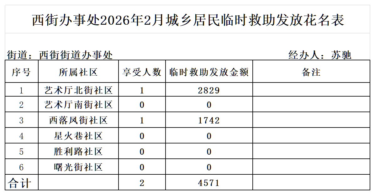 新城区西街街道办事处2026年2月城乡临时救助补贴发放情况
