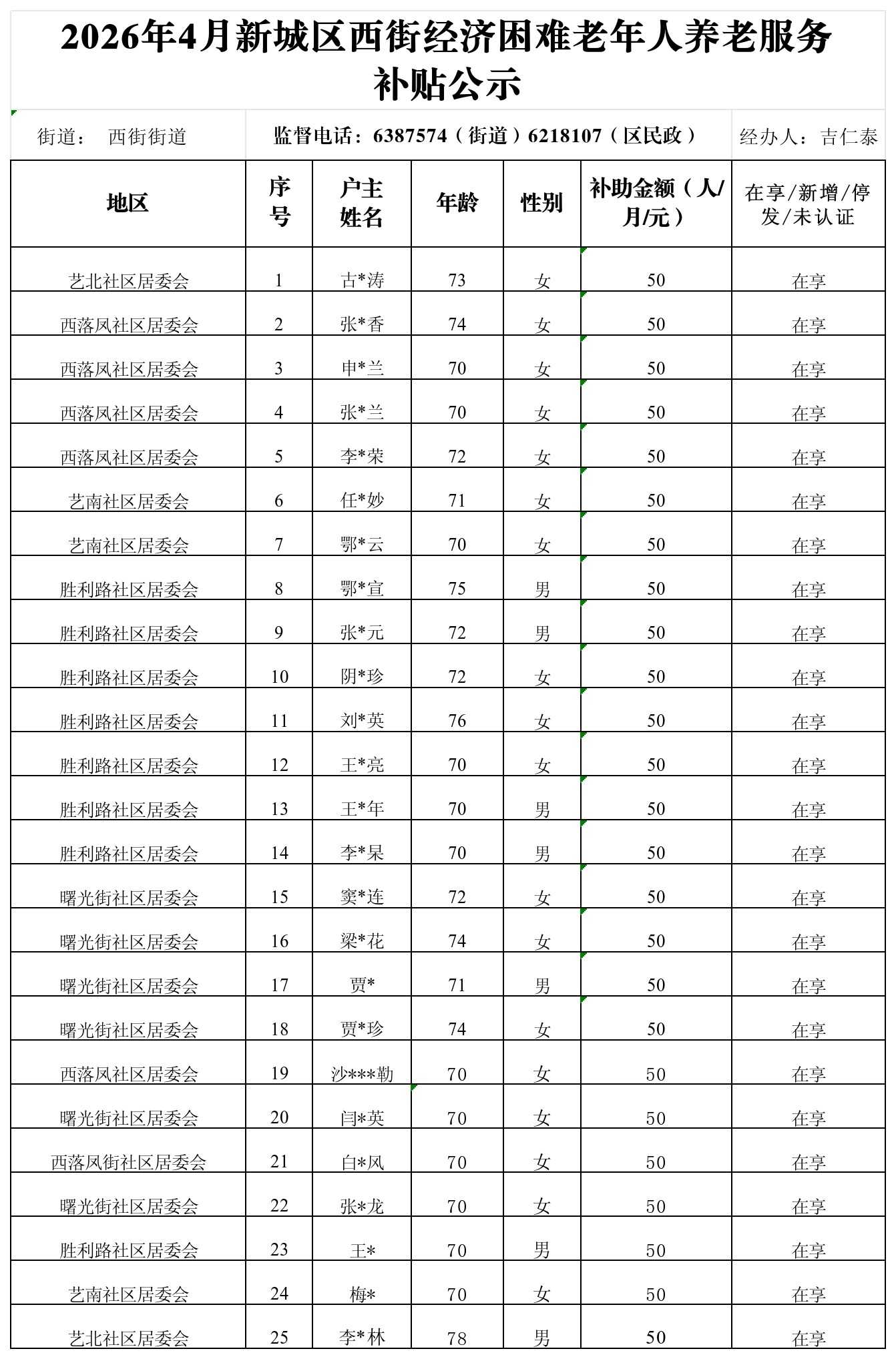 新城区西街街道2026年4月经济困难老年人养老补贴发放情况