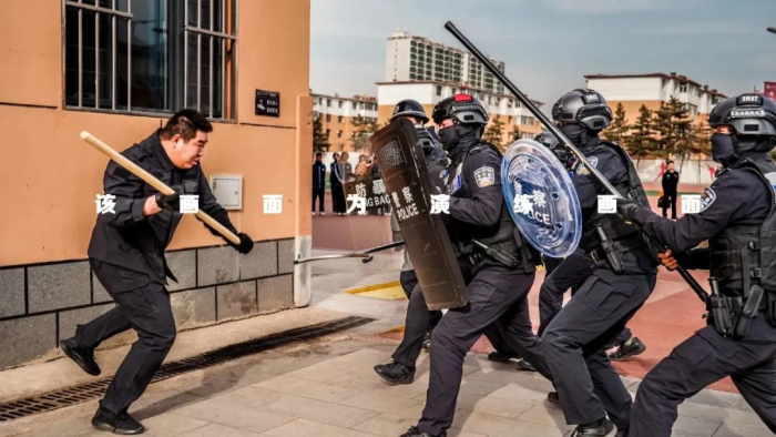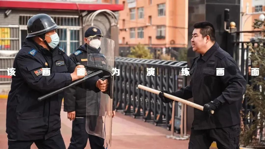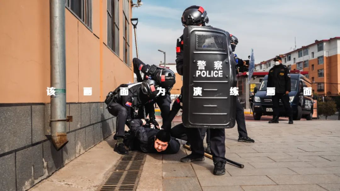 本次反恐演练模拟校园安全突发场景,由反恐怖与特巡警大队队员扮演的“暴恐分子”手持木棍、酒瓶等武器闯入校园。安保人员随即使用防暴盾牌应急棍与其对峙并触发校内警报。在校内活动的学生在老师引导下迅速撤离至教学楼内或就近隐蔽。与此同时,校方立即报警。新城区公安分局反恐怖和特巡警大队队员接到报警后,穿戴防刺服,携单警装备、防暴盾牌等警用装备快速赶往现场进行处置,在队员的战术协同下迅速制服“暴恐分子”并将其带离现场。
