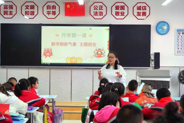 扬帆新启航,逐梦向未来。开学第一天,新城区北垣小学四年级八班的班主任吴娜组织班级开展新年新气象主题班会,带领同学们回顾刚刚过去的春节,与大家一起探讨对新学期的期待和学习目标。明确了校园生活的各项要求,也对本学期提出了期盼和祝福。