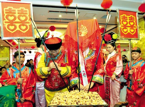 近日,满族姑娘果尔佳园和汉族小伙子邢哲在呼和浩特市举办了原生态的满族婚礼。婚礼上,坐花轿、“踩呼吉彦加夫”(满语:倒红毡)、拜“奈胡”(满语:拜北斗)、迈“费勒库”(满语:火盆)、跨“恩格慕”(满语:跨马鞍)、挑盖头、夫妻对拜、行“合卺礼”(满语:交杯酒)等环节,让宾客感受了浓浓的满族婚礼文化气息。(记者 魏宝红摄)