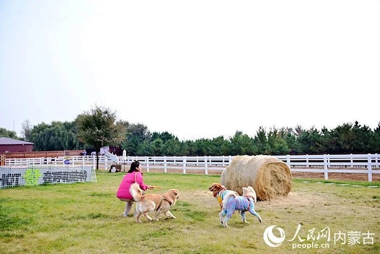 游客在峪见小镇和狗狗一起玩耍。人民网记者 寇雅楠摄