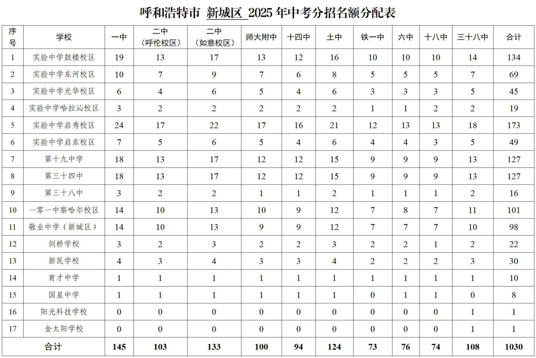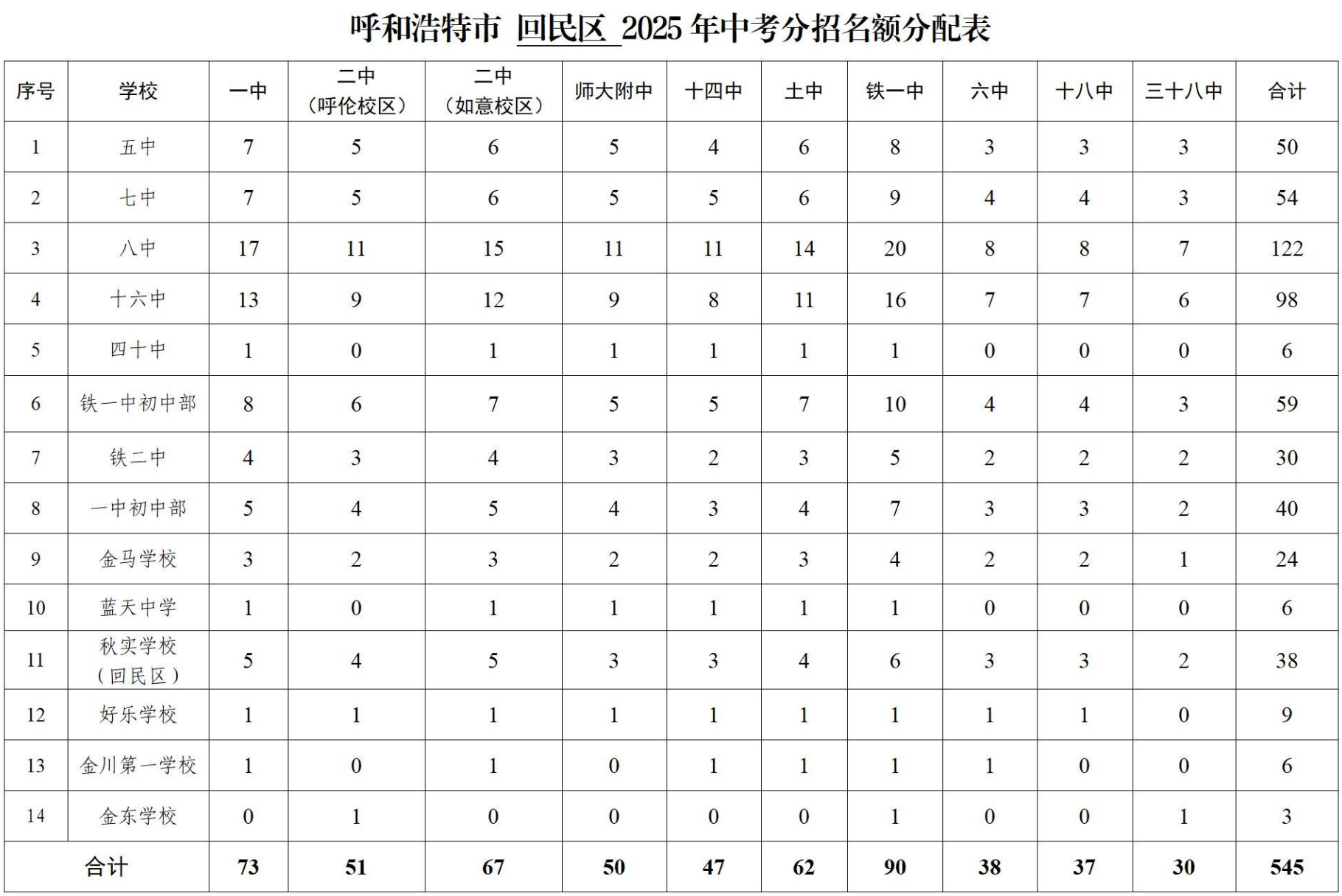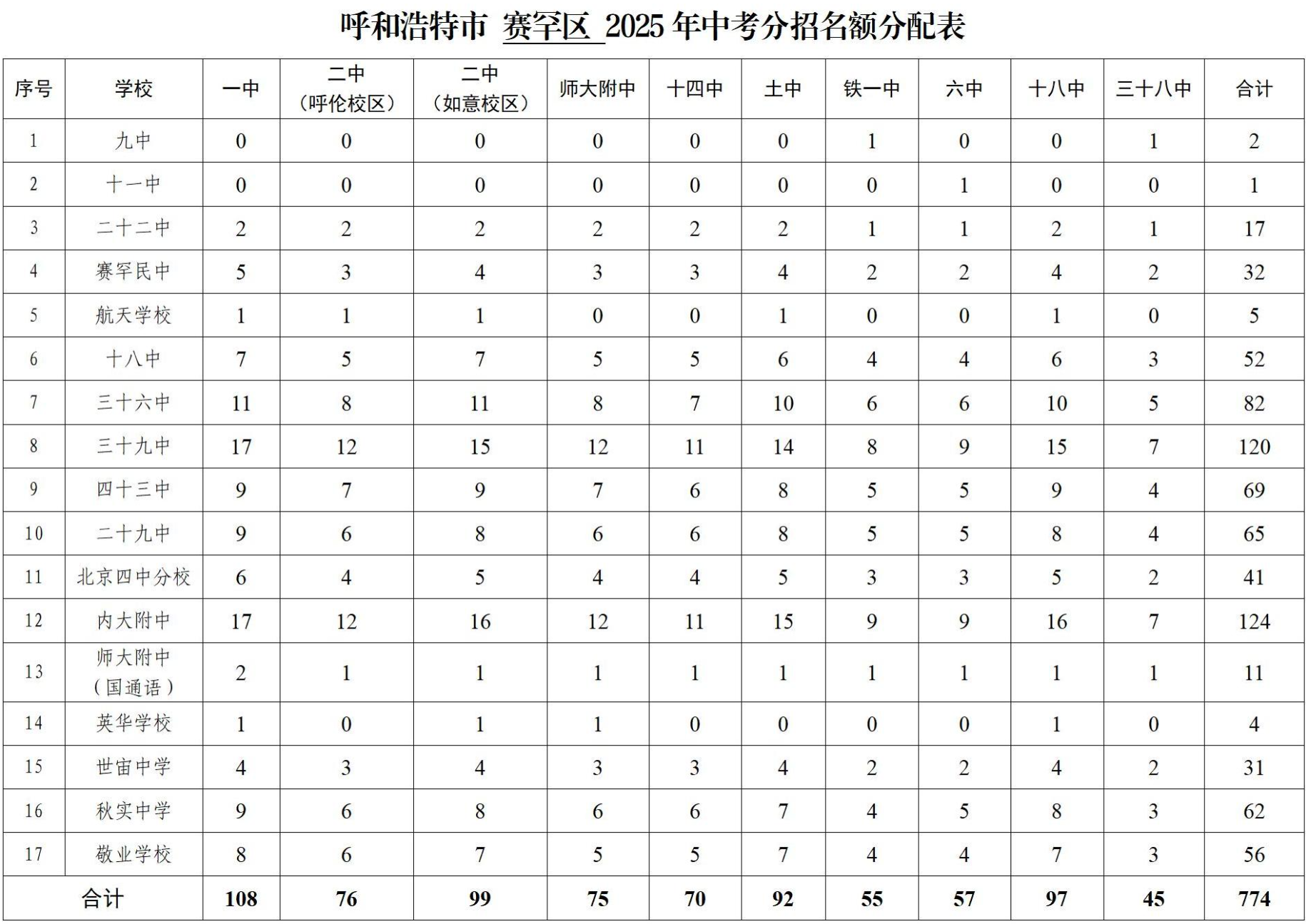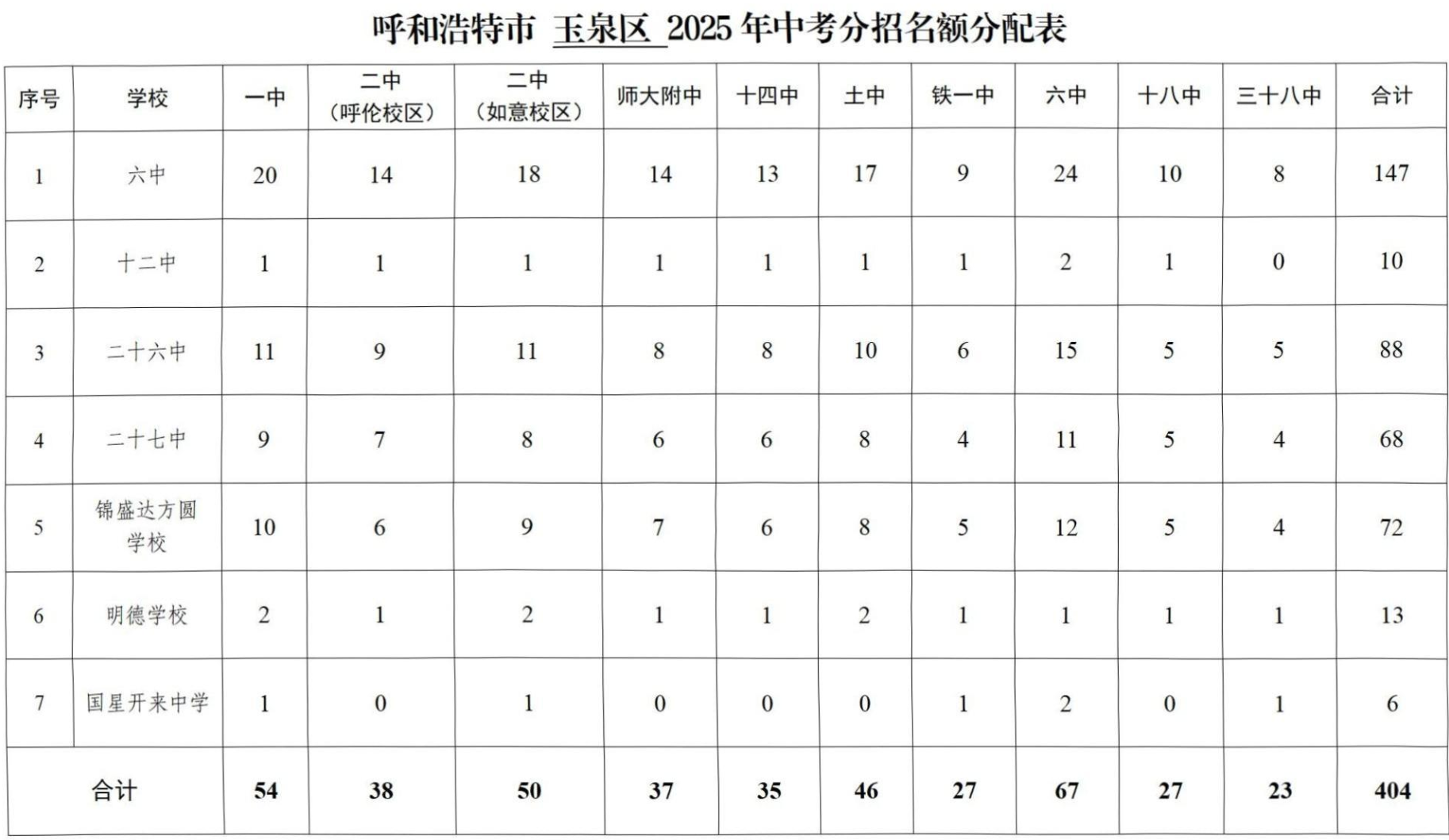 呼和浩特市2025年中考“分招”名额分配表公布
