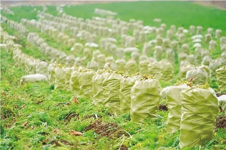 装袋的胡萝卜码放在田间等待装车