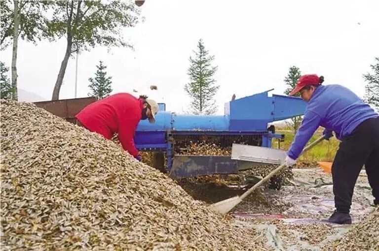 村民正在操作脱粒机处理葵花
