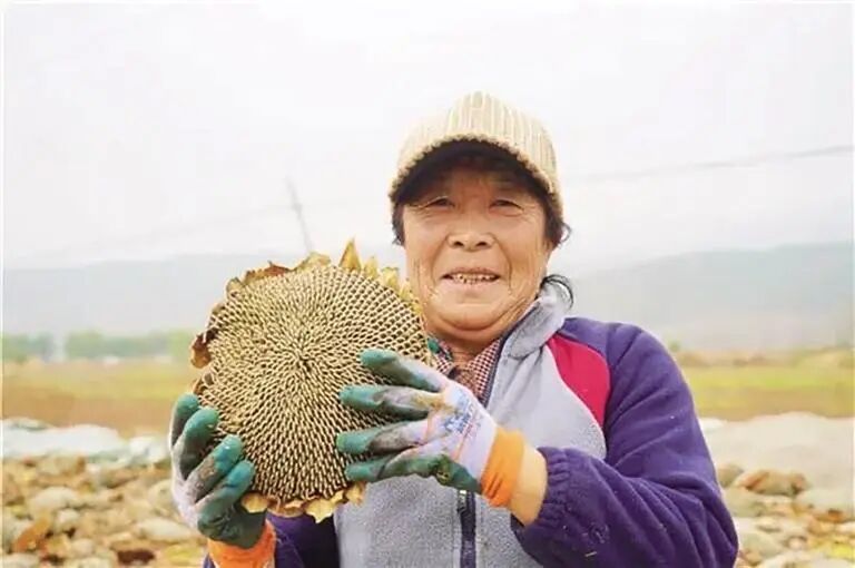 同一时间,保合少镇面铺窑村的葵花地里,另一番丰收景象同样热闹。一台红色的脱粒机在田间运转,村民们抱着沉甸甸的葵花盘排队等候,有的人将花盘塞进脱粒机的进料口,葵花籽便随着机器轰鸣倾泻而出,落在下方的塑料布上。不一会儿,脱好的葵花籽就堆成小山,阳光洒在上面,泛着温润的光泽,空气中弥漫着淡淡的葵花籽清香。“你看这葵花籽,颗粒饱满,今年肯定能卖个好价钱。”村民李大姐拿起一把葵花籽,轻轻剥开外壳,饱满的果仁令人垂涎。她身旁的孩子抱着刚摘下的葵花盘,兴奋地向伙伴展示:“我这个花盘最大,里面的葵花籽最多。”田边的空地上,已装袋的葵花籽垒起了好几摞,袋子上都贴着标签,标注着采收日期和重量,等待着后续的晾晒和销售。