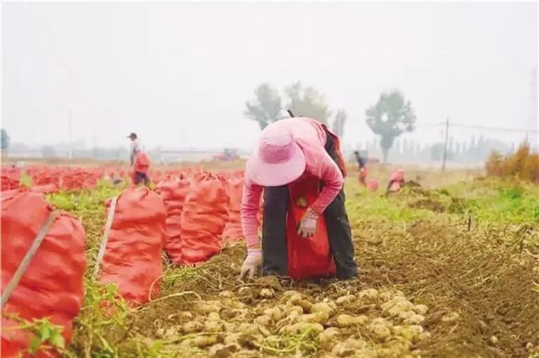 村民穿梭在田间收土豆