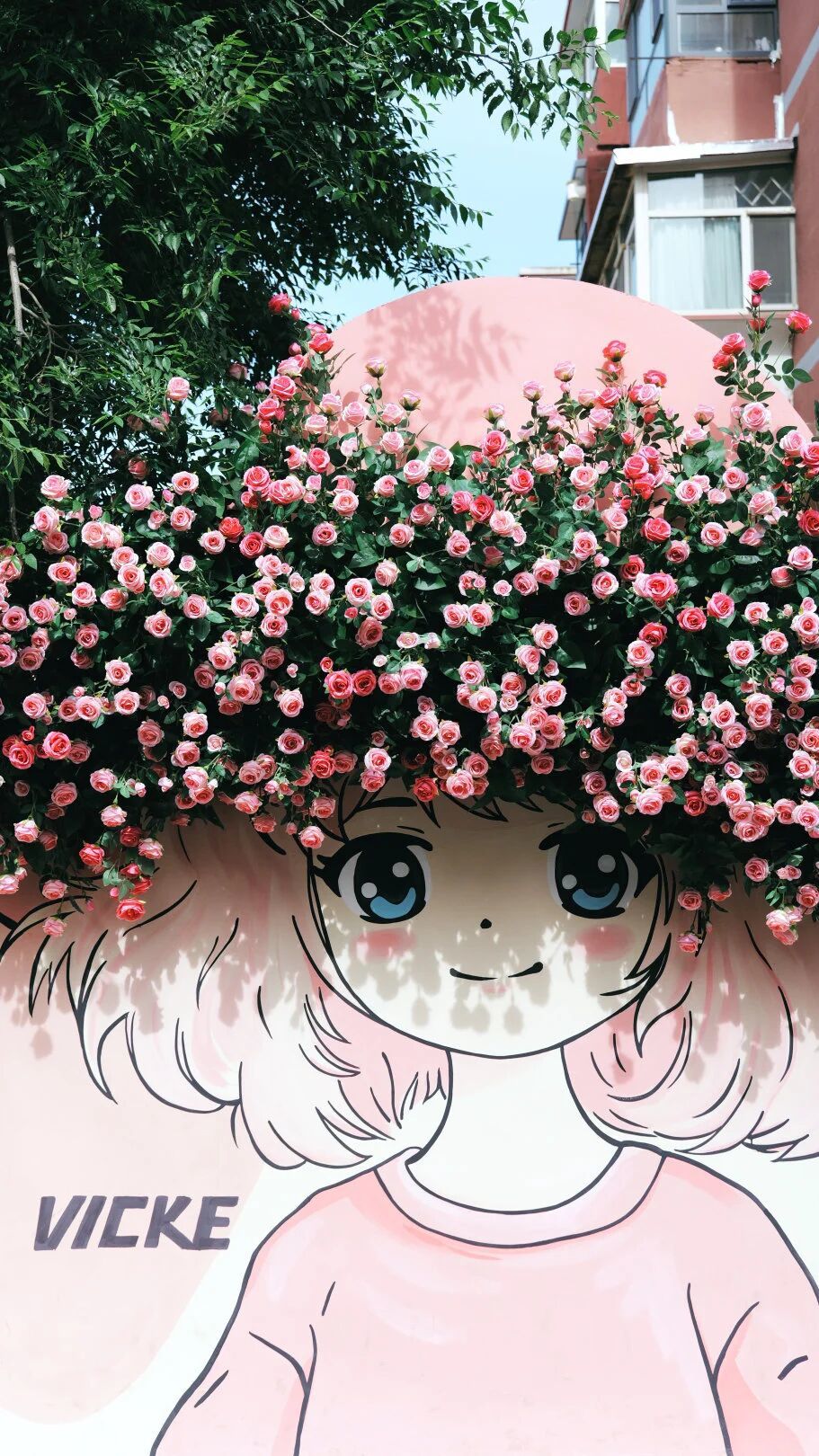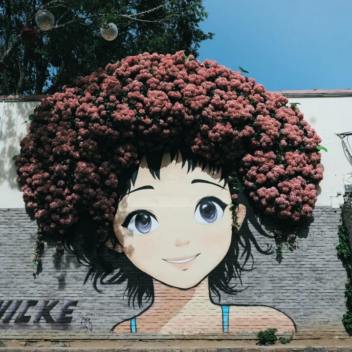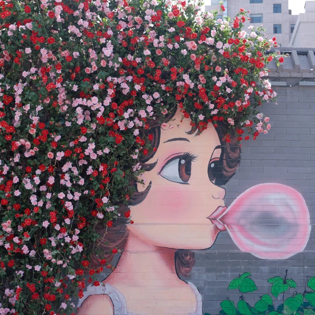 在东护城河北街和庆凯桥街区,墙绘上的少女,头顶被盛开的粉色花朵覆盖,像是把春天编成了头发和帽子。整面墙被粉白相间的花簇拥着,站在前面随手一拍,就是一张春日大片。