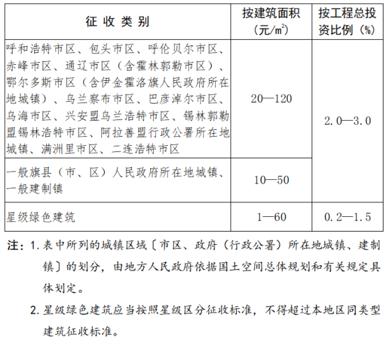第五条 各盟市应当按照国家及自治区有关工作要求,在本办法明确的配套费征收标准区间(详见附件1)内确定本地区具体征收标准,适当区分城镇区域、住宅和非住宅、星级绿色建筑等不同征收类别,原则上整体不增加缴费人负担。