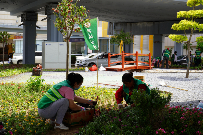 在哲昭路鼓楼桥底的口袋公园,不时有三五成群的市民驻足停留,或观赏新植的花草,或休憩在旱溪旁,在城市的喧嚣中,寻得一隅静谧之地。