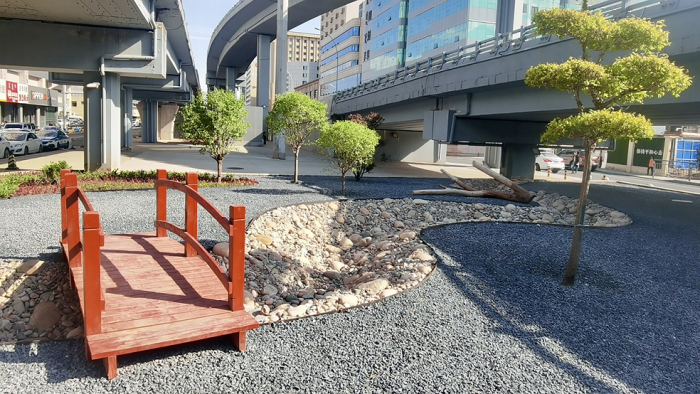 本次鼓楼桥下空间口袋公园改造提升面积约1300平方米,通过花境栽植、景观置石与碎石铺装结合等方式,让空间氛围更为活泼,人们可以在此休憩,畅谈,集会,享受一份城市喧嚣中的些许宁静。同时我们考虑到每临雨雪天气,水土易流失,且桥下光照不足,不利于绿化苗木生长,参照海绵城市建设理念,将桥下排水管道接入旱溪,充分利用桥面排放的客水引入绿地,节约养护成本的同时,兼备生态功能。