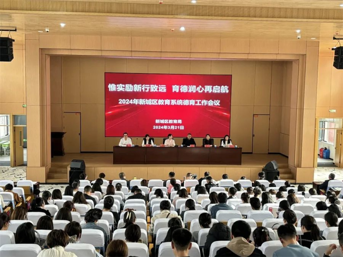 为深入贯彻落实立德树人根本任务,加强对新城区校(园)德育工作的指导,2024年3月21日下午,新城区教育局召开“惟实励新行致远 育德润心再启航——2024年新城区教育系统德育工作会议”。新城区教育局副局长商辉、德育股全体干部、各公民办中小学、幼儿园德育分管领导、大队辅导员、中学团委书记、专(兼)职心理健康教师200余人参会。会议由德育股股长张丽梅主持。