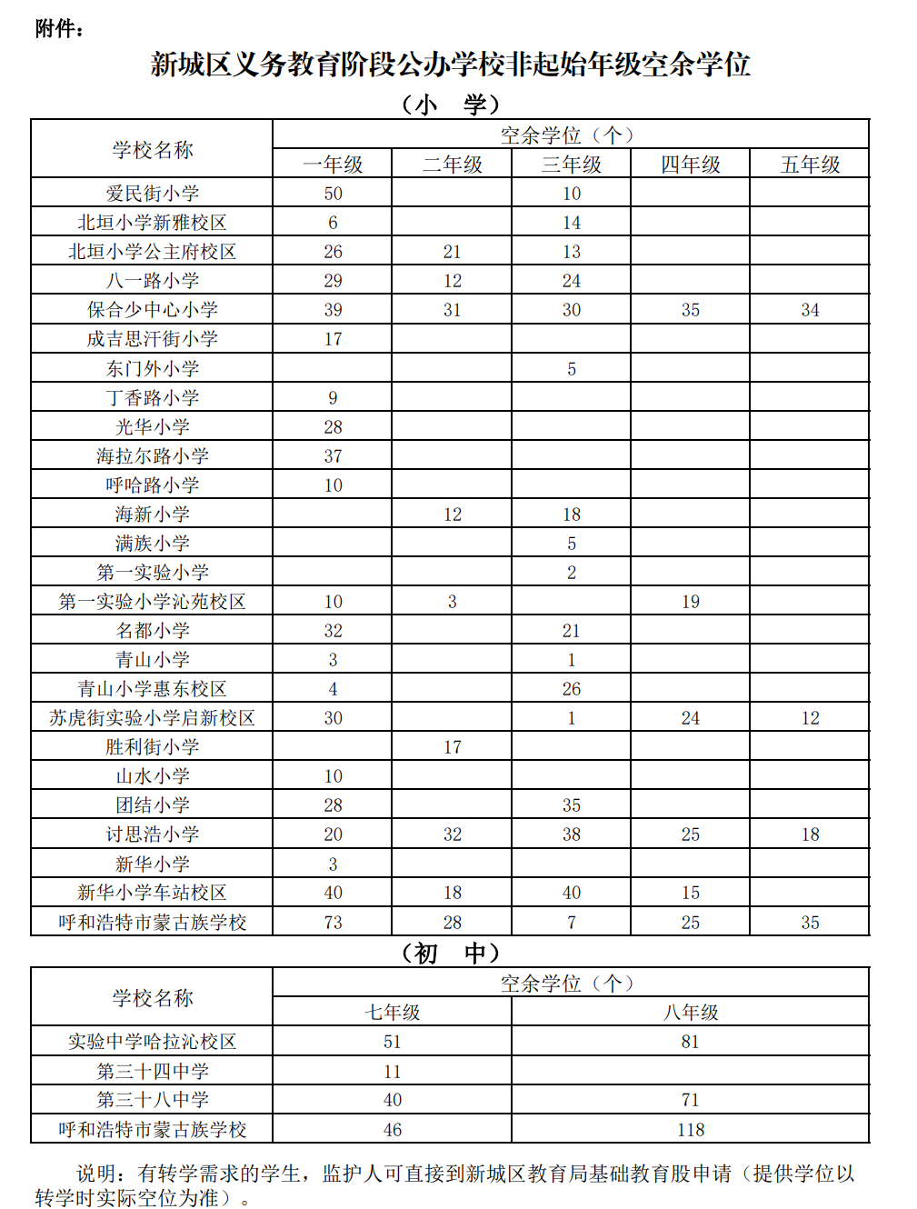 依照《呼和浩特市人民政府关于促进人口集聚推动人口高质量发展的实施意见》(呼政发〔2025〕7号)文件要求:“市四区每学期公布义务教育阶段公办学校非起始年级空余学位,优先保障来呼人员子女转学需求”,以及《呼和浩特市教育局关于做好2025年义务教育阶段招生入学有关工作的通知》(呼教通字〔2025〕17号)文件要求:“每学期定期公布义务教育阶段公办学校非起始年级的空余学位情况,针对来呼人员子女,优先保障其在有空余学位的公办学校就近入学”,现将新城区义务教育阶段公办学校非起始年级空余学位予以公布。