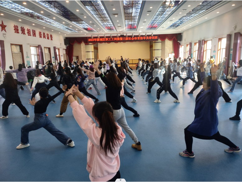 4月7日,新城区职工工间操暨三级社会体育指导员培训班在新城区成吉思汗大街街道办事处文体馆开班。来自全区各单位、各中小学选派的100余名文体骨干参加此次培训。
