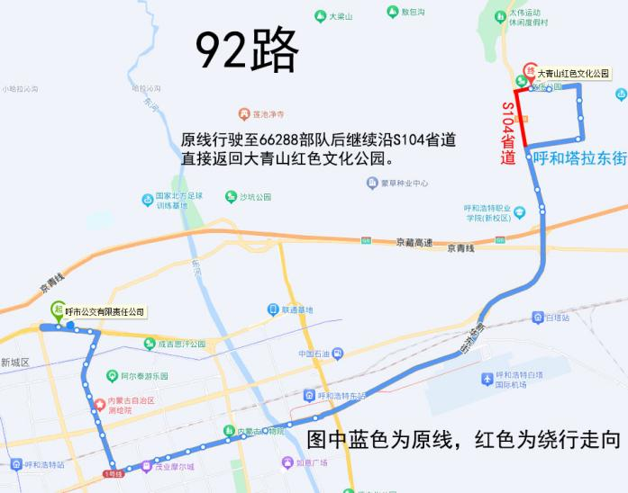 (1)92路:原线行驶至66288部队后继续沿S104省道直接返回大青山红色文化公园。双向绕行。