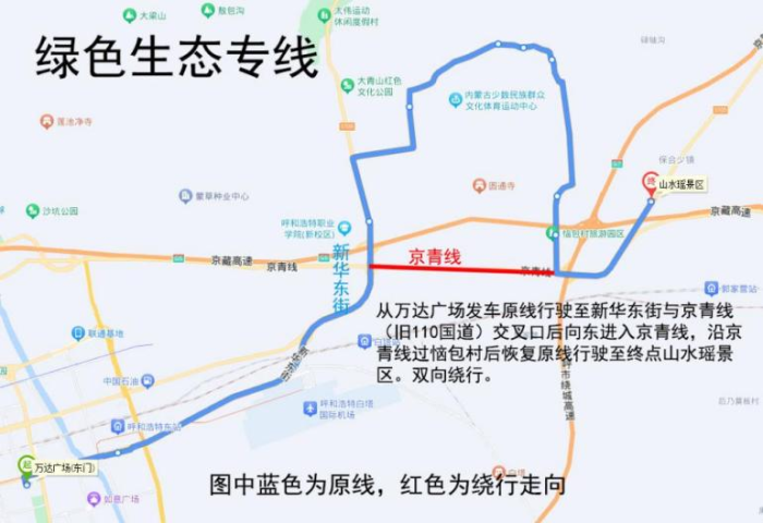 (4)绿色生态专线:从万达广场发车原线行驶至新华东街与京青线(旧110国道)交叉口后向东进入京青线,沿京青线过恼包村后恢复原线行驶至终点山水瑶景区。双向绕行。