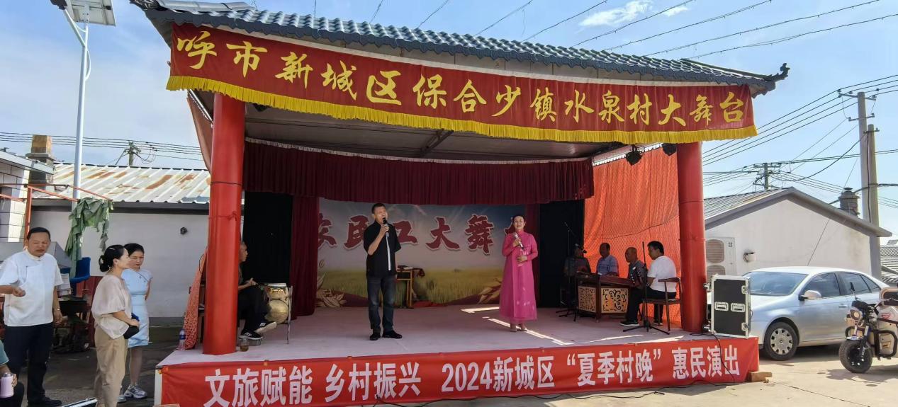 下午,新城区文化馆专业人员与业余团队共同举办了一台别开生面的“夏季村晚“惠民演出,文化馆专业人员与业余团队同台表演了各具特色的文艺节目,歌曲《不忘初心》《梦中的呼和浩特》《天堂草原》,小戏《牧牛》,二人台《打金钱》等一个个精彩的节目吸引了附近各村的众多村民扶老携幼前来观看。