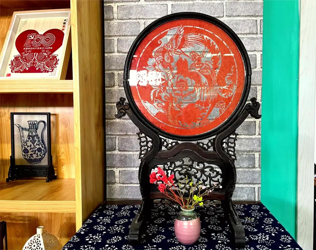 一双巧手、一把剪刀、几张红纸,伴随着剪刀有节奏的喀嚓声,红红的纸屑纷纷飘落,没一会儿,一幅作品就完成了。