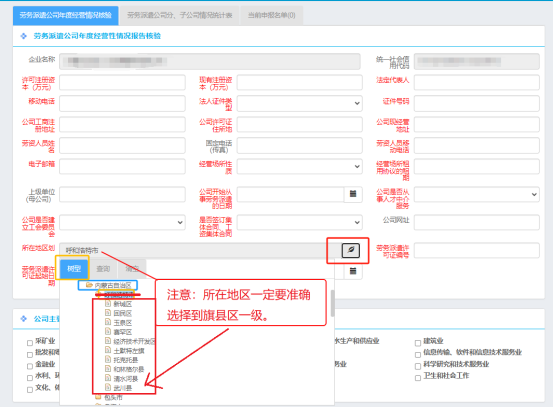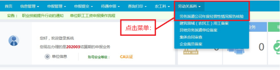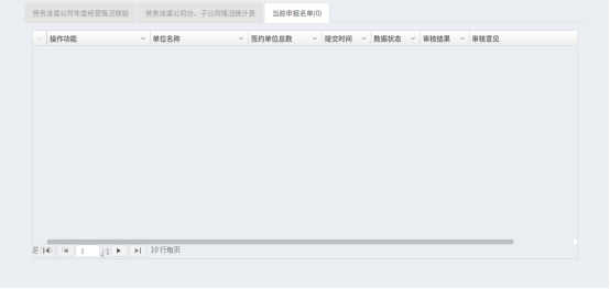 在系统中导航栏中选择“劳动关系科”下的“劳务派遣公司年度经营情况报告核验”,进入数据填报页面,填写上一年度经营数据(务必完整准确填报所有数据)。