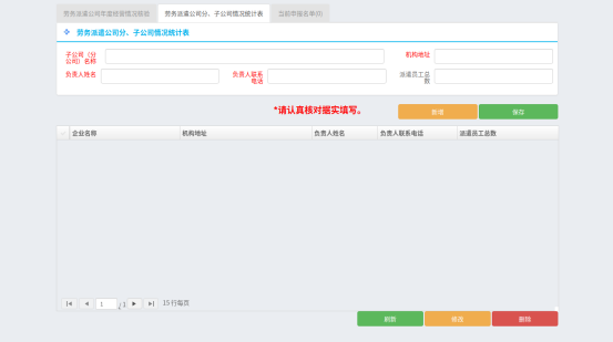 在系统中输入页面切换至“劳务派遣公司分子公司情况统计表”,完成分子公司信息填报。