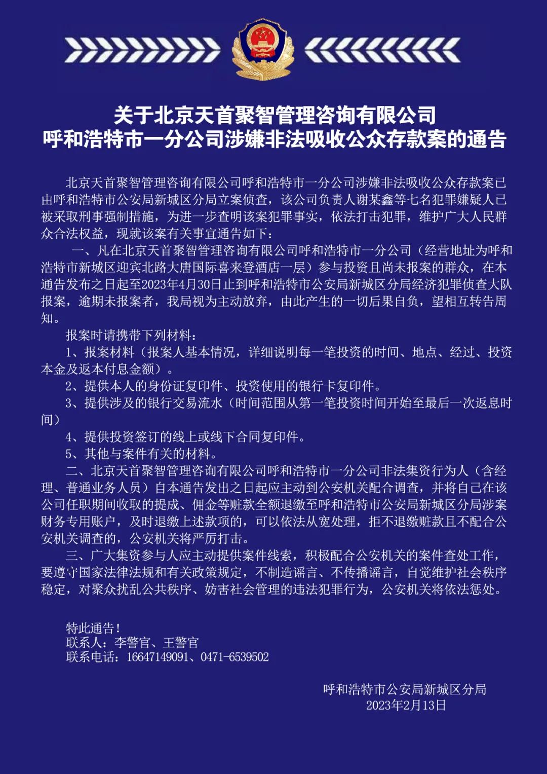关于北京天首聚智管理咨询有限公司呼和浩特市一分公司涉嫌非法吸收公众存款案的通告