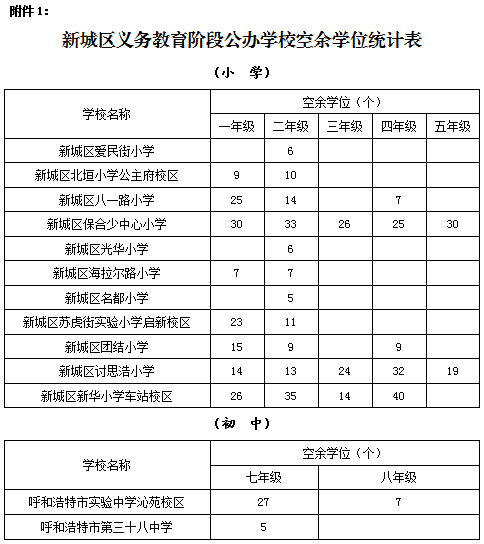 附件1:新城区义务教育阶段公办学校空余学位统计表