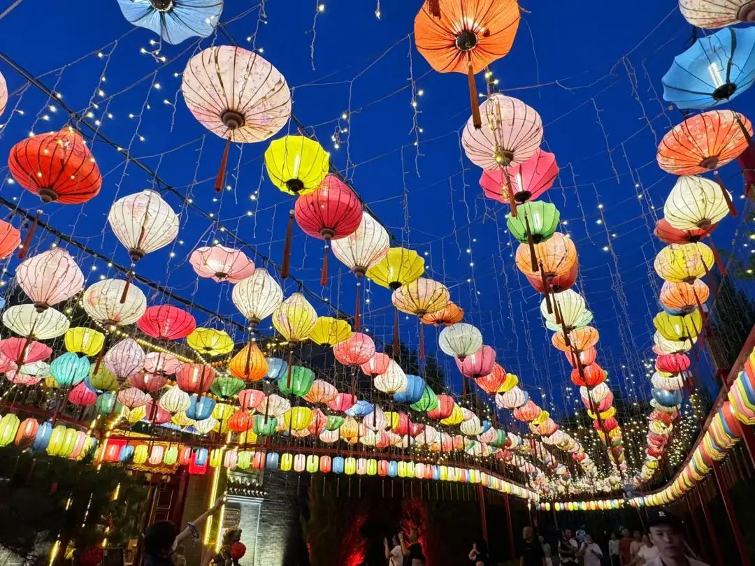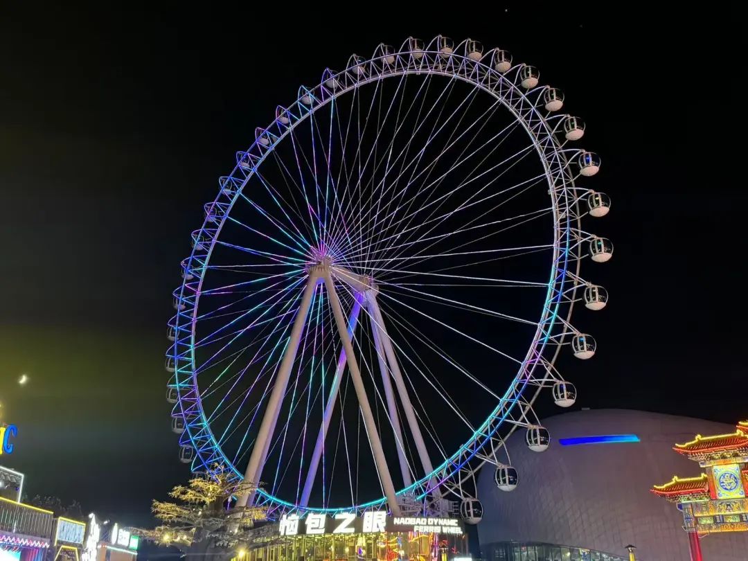乘坐“恼包之眼”摩天轮,缓缓上升至百米高空。恼包村灯火辉煌,与璀璨星空相互映衬,满满的浪漫氛围。