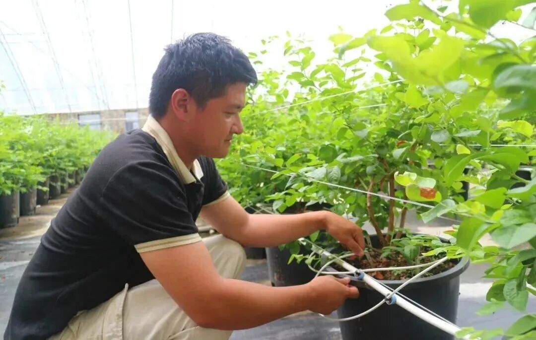 嘉仕蓝莓智慧园区工人正在调整滴灌设施。刘沙沙 摄