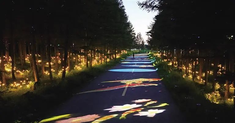 哈达门国家森林公园内,草甸向天边延展。夜幕降临,林间灯光闪烁,林荫路上光影流转,晚风拂面,漫步其间,惬意十足。