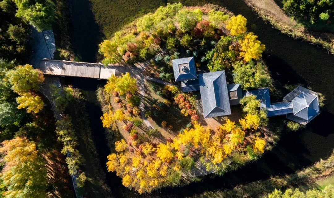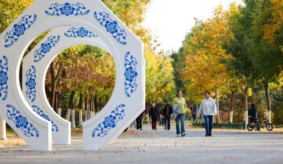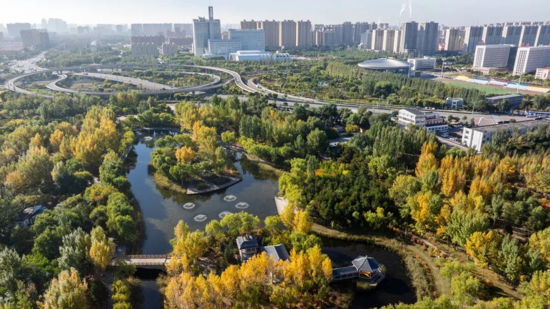 公园内杨柳金黄耀眼,枫树、火炬树等彩叶树种纷纷换上红妆,与常绿植物相互映衬。