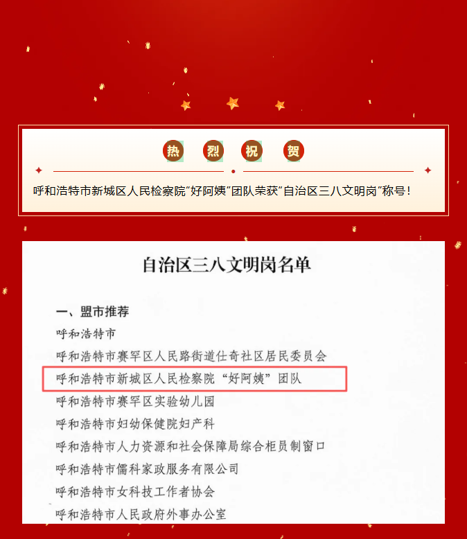 近日,自治区妇联对2025年度各行各业、各个领域充分发挥“半边天”作用、创造非凡业绩的先进个人、先进集体,以“三八红旗手标兵”“自治区三八红旗手”、“自治区三八红旗集体”、“自治区三八文明岗”予以表彰,呼和浩特市新城区人民检察院“好阿姨”团队荣获“自治区三八文明岗”称号,这是对“好阿姨”团队在未成年人检察工作中所展现的责任与担当给予的充分肯定。