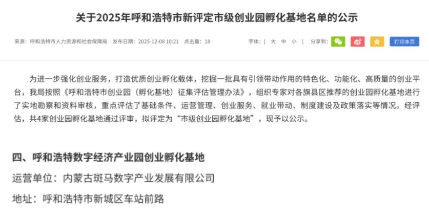近日,呼和浩特市人力资源和社会保障局对2025年新评定市级创业园孵化基地名单进行公示。落地新城区、由内蒙古斑马数字产业发展有限公司负责运营的呼和浩特数字经济产业园通过专家评审,拟认定为市级创业园孵化基地。