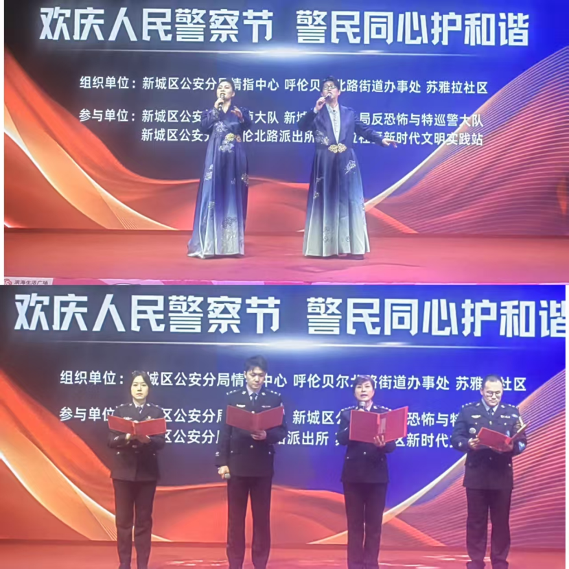 1月10日,由新城区公安分局情指中心、呼伦贝尔北路街道办事处和苏雅拉社区联合组织,新城区公安分局刑侦大队、新城区公安分局反恐怖与特刑警大队、新城区公安分局呼伦北路派出所和苏雅拉社区新时代文明实践站共同参与的“欢庆人民警察节 警民同心护和谐”主题宣传活动在滨海生活广场举行。