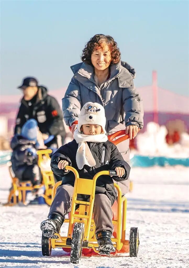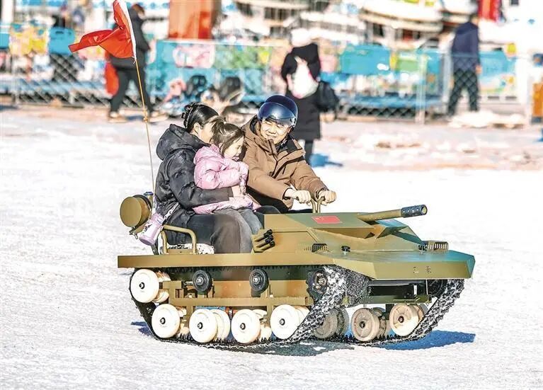 冰雪运动区热闹非凡,雪地漂移项目带来极速快感,点燃现场气氛;亲子同乘雪地摩托驰骋雪原,欢声笑语不断;雪地转转匀速旋转,座舱中盛满孩童的清脆笑声;冰场上,各式冰车穿梭往来,大人小孩共拾童年乐趣,暖意驱散寒意。