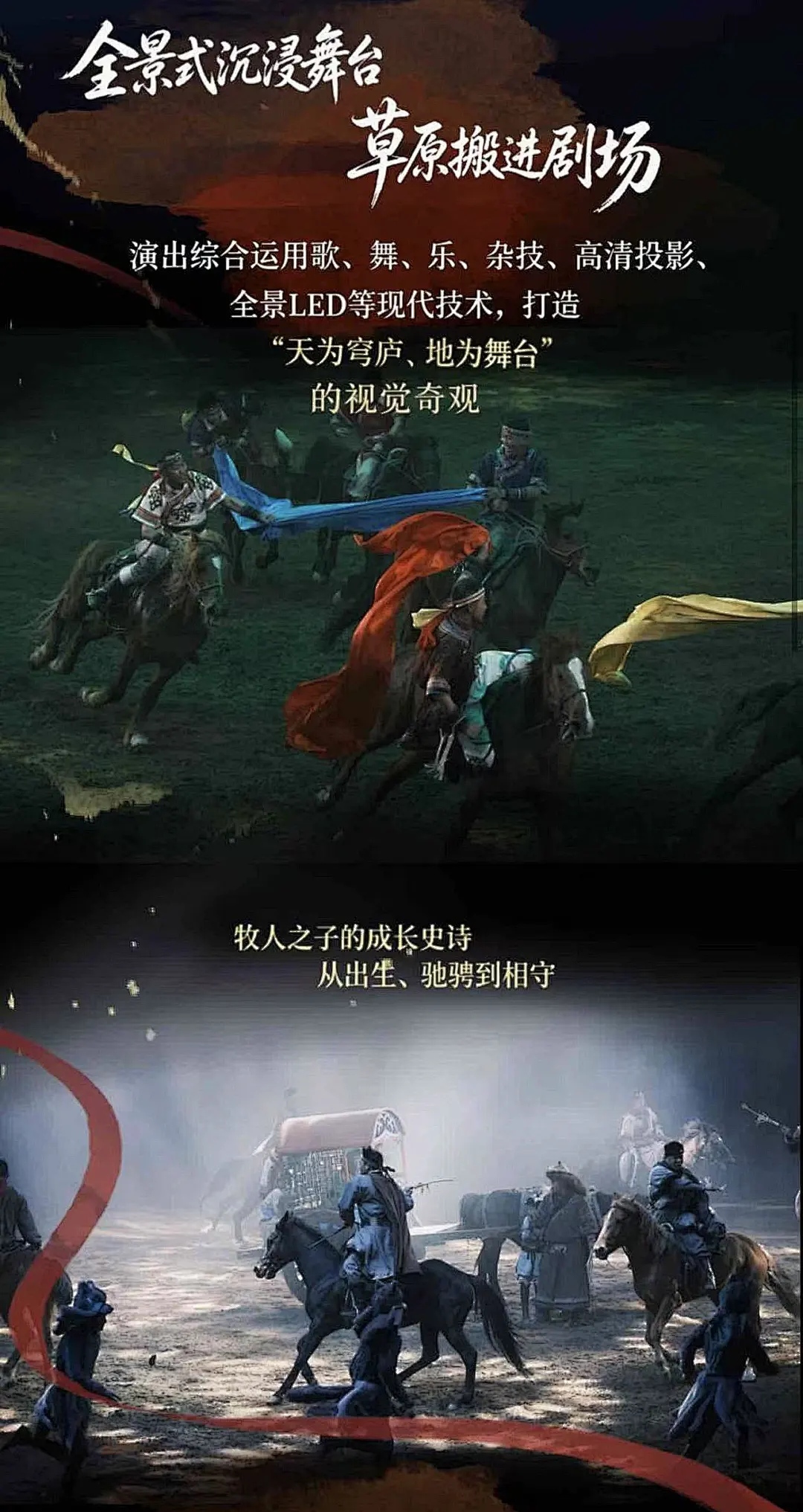 全景LED、高科技声光电加持,还原草原、沙漠、烽火狼烟等震撼场景,沉浸式穿越千年;