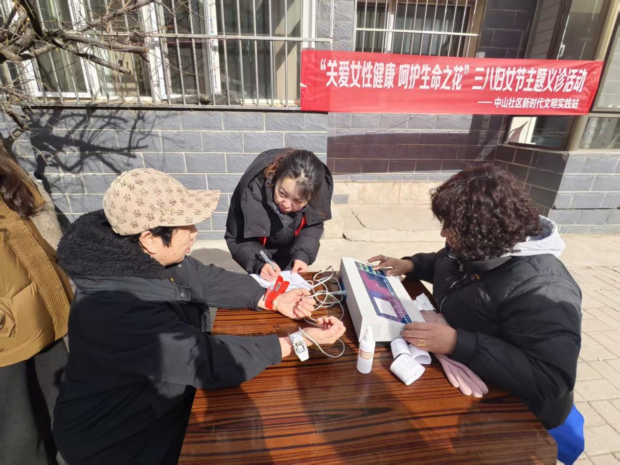 锡林郭勒北路街道中山社区新时代文明实践站联合内蒙古亲馨社区服务中心,在水利厅小区开展“情暖三八节 健康护芳华”免费义诊活动。活动现场划分心脑血管检查区与中医把脉问诊区,医护人员细致为居民测量血压、筛查异常指标,讲解疾病预防常识;中医医师运用望闻问切传统诊疗手法,针对常见问题提供个性化调理建议。社区工作人员全程贴心服务,让居民在家门口享受到专业的健康关怀。